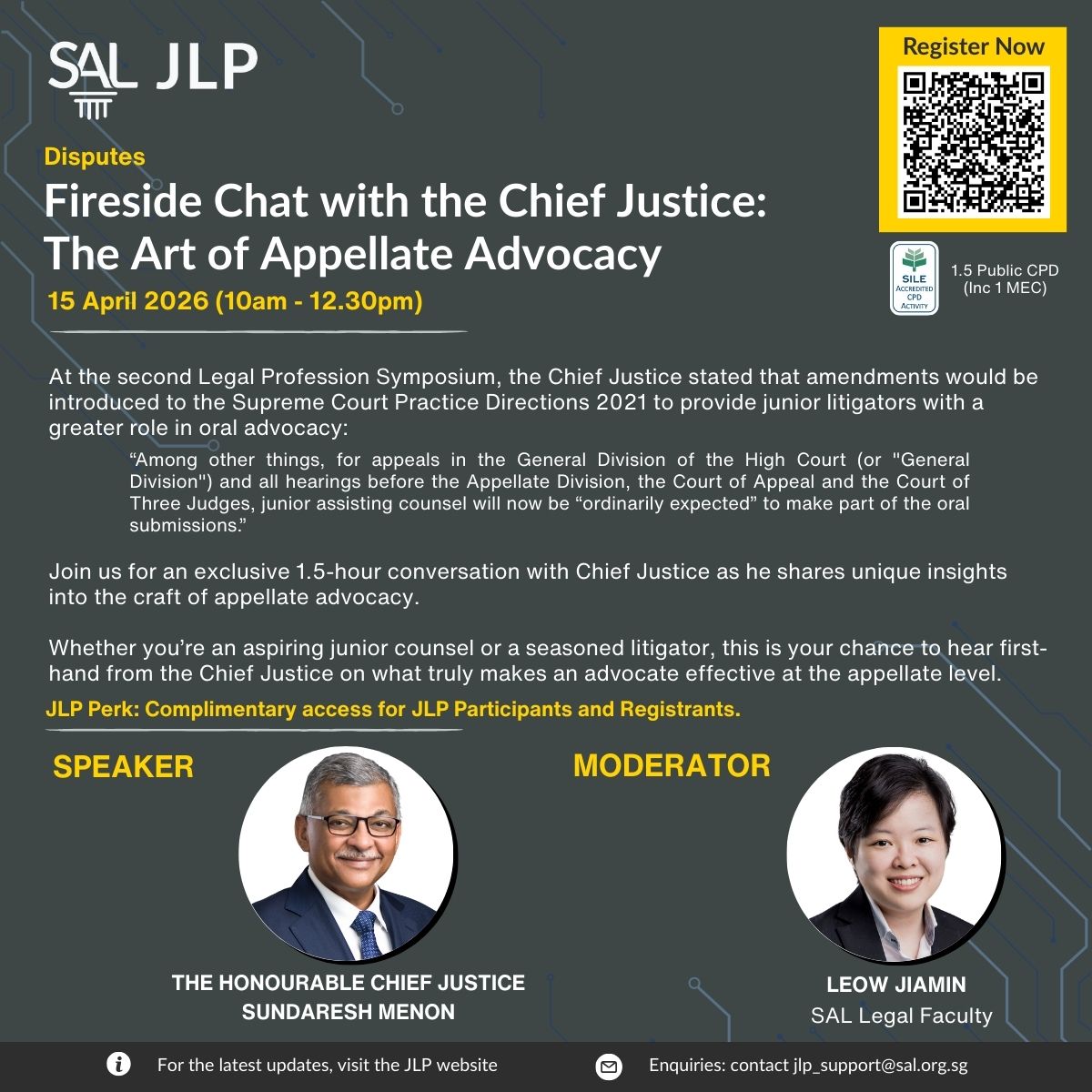 Join us for an exclusive 2-hour conversation with Chief Justice Sundaresh Menon as he shares unique insights into the craft of appellate advocacy — from persuasive written submissions to impactful courtroom delivery. Whether you’re an aspiring junior counsel, a seasoned litigator, or simply passionate about the art of persuasion, this is your chance to hear first-hand from the Chief Justice on what truly makes an advocate effective at the appellate level.
